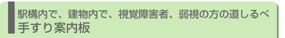 視覚障害者にとって駅構内や建物内で頼りとなる道しるべは、点字併記の手すり案内板です。 当社の透明点字は、多くの人が長期にわたって触れても磨耗しません。墨字も大きく併記されるため、弱視の方にご利用いただるのはもちろん、高齢者の方にも目印となります。
